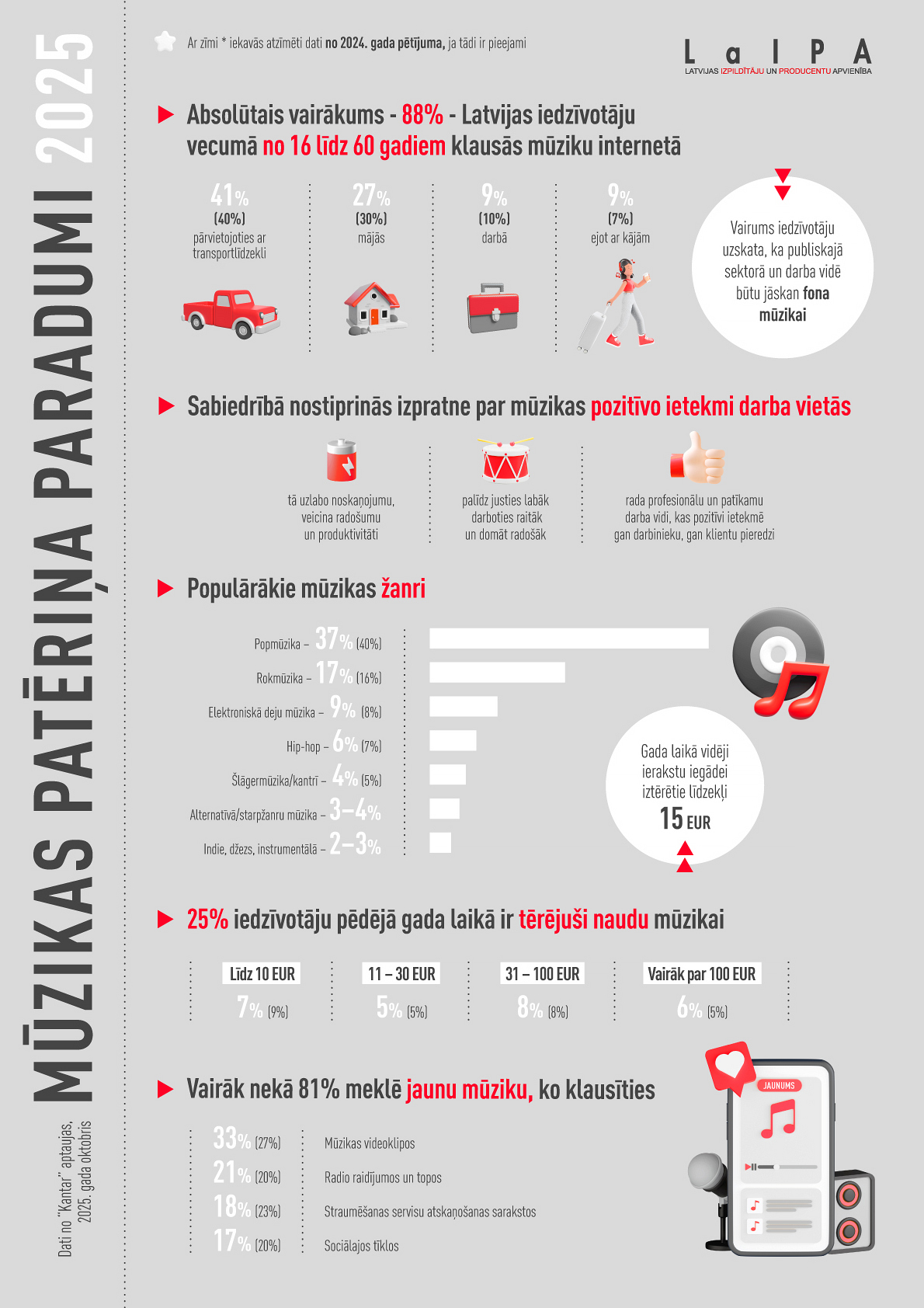 Iepazīties ar šī un iepriekšējo gadu pētījumiem par mūzikas patēriņa paradumiem Latvijas sabiedrībā var LaIPA mājaslapā links: https://ej.uz/laipa_muzikas_paterina_indekss