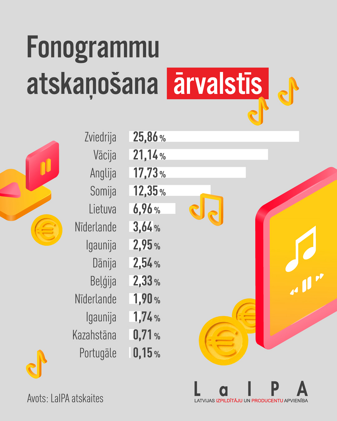 2025. gadā LaIPA demonstrējusi stabilu un ilgtspējīgu attīstību gan finanšu, gan darbības rādītājos. LaIPA saņemtie ieņēmumi no kolektīvās tiesību pārvaldības 2025. gadā sasnieguši 4 023 969 eiro. Salīdzinājumā ar 2024. gadu ieņēmumi pieauguši par 3%, kas apliecina kolektīvā pārvaldījuma sistēmas ilgtspēju un fonogrammu izmantošanas nozīmi dažādās nozarēs. Atlīdzību sadalījums pa segmentiem atspoguļo galvenos mūzikas izmantošanas veidus un to īpatsvaru LaIPA ieņēmumu struktūrā, iezīmējot līdzsvaru starp tradicionālajiem un mūsdienu izmantošanas kanāliem.
