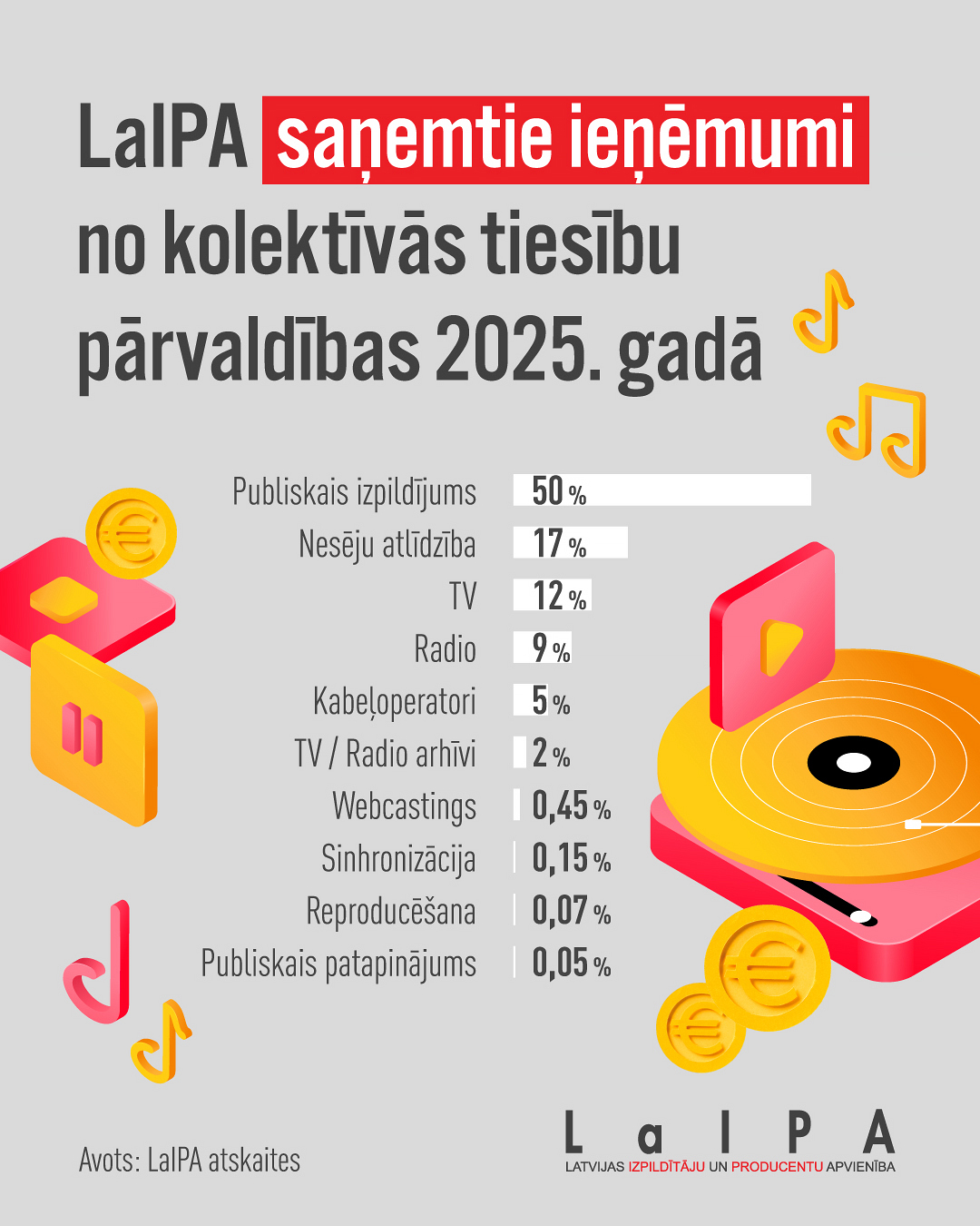 2025. gadā LaIPA demonstrējusi stabilu un ilgtspējīgu attīstību gan finanšu, gan darbības rādītājos. LaIPA saņemtie ieņēmumi no kolektīvās tiesību pārvaldības 2025. gadā sasnieguši 4 023 969 eiro. Salīdzinājumā ar 2024. gadu ieņēmumi pieauguši par 3%, kas apliecina kolektīvā pārvaldījuma sistēmas ilgtspēju un fonogrammu izmantošanas nozīmi dažādās nozarēs. Atlīdzību sadalījums pa segmentiem atspoguļo galvenos mūzikas izmantošanas veidus un to īpatsvaru LaIPA ieņēmumu struktūrā, iezīmējot līdzsvaru starp tradicionālajiem un mūsdienu izmantošanas kanāliem.
